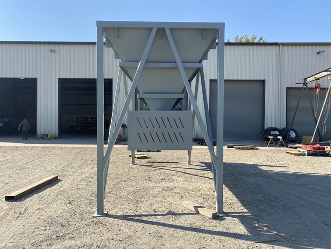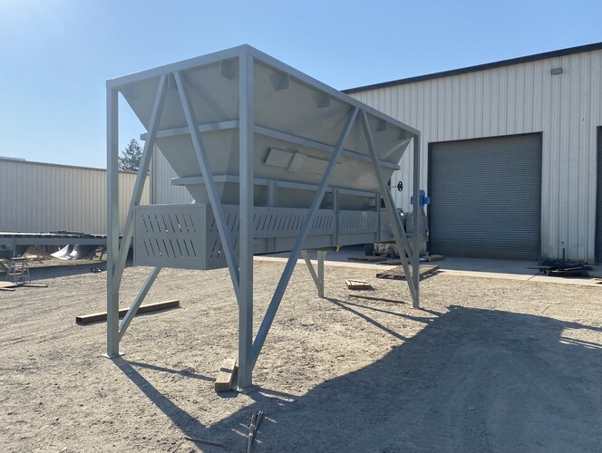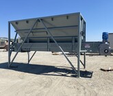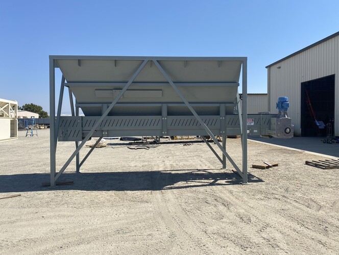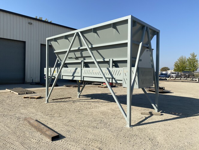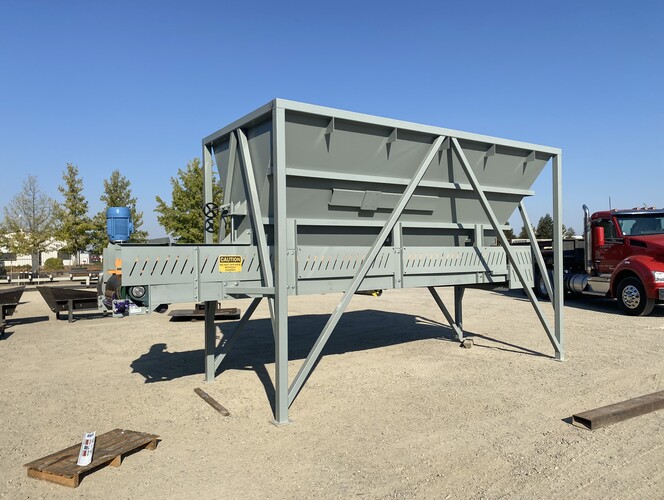 a. 6’-7" wide x 16’ long hopper opening constructed from 1/4” thick steel plate with square tube reinforcing at the hopper top and angle iron reinforcing at the hopper mid-section and bottom section; self-relieving tapered hopper bottom opening to minimize bridging; full length skirtboards with 3/4" x 6" adjustable rubber flashing to prevent leakage between hopper bottom and belt feeder; adjustable discharge gate with hand crank out the side to control material flow from the hopper.