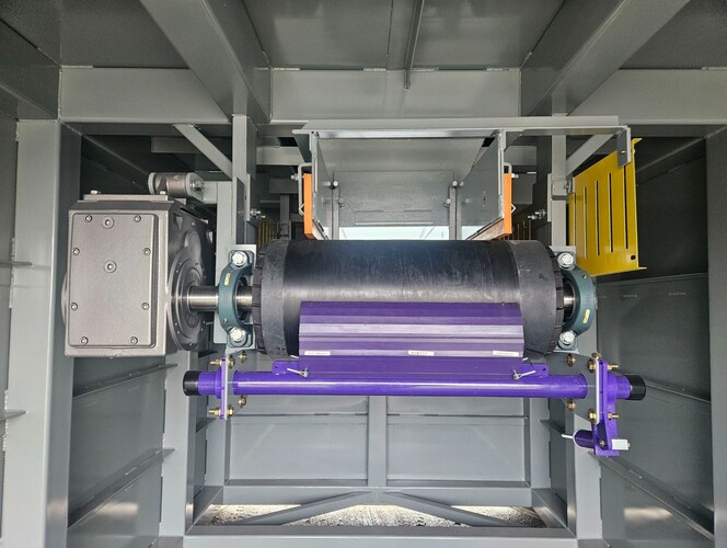 e) 30” wide x 6’ long roller belt feeder with 7.5 HP C Face premium efficient electric motor; Nord gearbox; 12” diameter rubber lagged head pulley mounted on 2-15/16” diameter 1045TGP shafting; 12” self-cleaning tail pulley mounted on 2-7/16” diameter 1045TGP shafting; screw take-up assemblies; Dodge SCM pillow block bearings; nip guards and tail terminal guard; CEMA C flat belt idlers mounted on 7" centers; 3 ply belting with 3/16” x 1/16” rubber covers vulancized endless; full length skirtboards with 3/4” x 6” skirtboard rubber; Flexco Rockline belt scraper. Belt speed setup for 66 feet per minute.