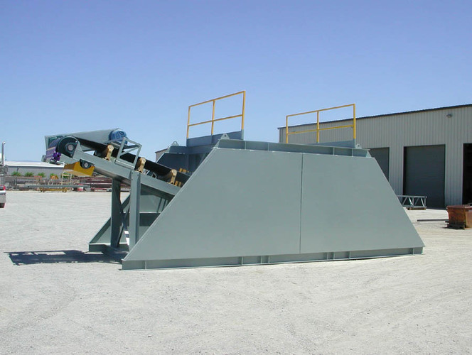 a) 8'-8" long hopper opening constructed of 1/4" thick steel plate with reinforcing; hopper capacity 5.3 cubic yards (7.2 tons of material weighing 100 lbs/cu. foot). Steep hopper walls allow contamination free unloading of multiple products.