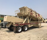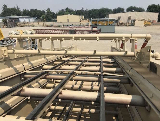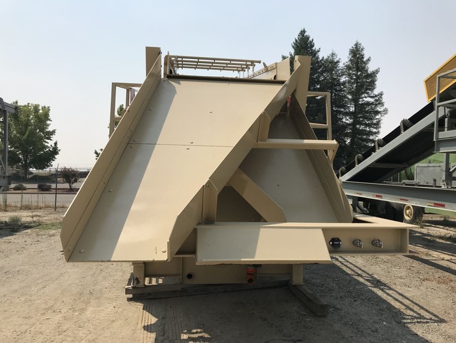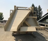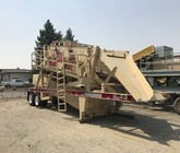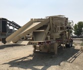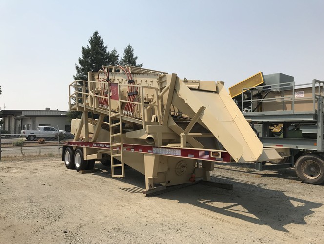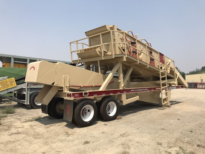 RD Olson portable wash plant with 5’ wide x 16’ long triple deck incline wet screen, 20 h.p. electric motor drive, 100 mm bearings with oil bath lubrication, manifold for water supply with 5 spray bar wash system per deck, rubber hoses and ball valves, slurry feed box, individual oversize discharge chutes, collecting hopper mounted under the screen, walkway with handrails on 3 sides of the screen with 2 access ladders; 36” diameter x 25’ long single spiral sandscrew complete with 15 hp electric motor, v-belt drive and drive guard; shaft mount gear reducer with oil bath lubrication; flare tub with adjustable weirs; bolt-on replaceable abrasion resistant wear shoes; grease lubricated lower bearing assembly mounted outside the tub; rising current feature; all mounted on a tandem axle chassis with 5th wheel pin, 10.00R x 22.5 tires, brakes, LED lights, support leg; primed and painted beige with red accents.
