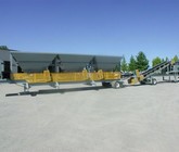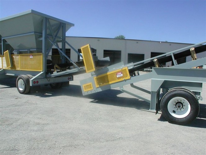 Rock Systems portable 3 bin blending hopper complete with 9’-6” wide x 14’ long bins with 20 ton storage capacity each; 30” wide roller belt feeders with 5 h.p. fixed speed electric motor drives, CEMA “C” 5” diameter flat belt idlers, full length skirtboards with REMA rubber, 3 ply vulcanized endless conveyor belting, discharge gate to control material flow; 36” wide collecting conveyor with 10 h.p. electric motor drive, CEMA “C” 35 degree troughing idlers with 5” diameter rolls, 9’-6” long conveyor extension beyond bins; all mounted on a single axle portable chassis with brakes, lights, mud flaps and 5th wheel pin. Includes electric motor control panel and wiring with variable speed drives for the belt feeders and fixed speed starter for the collecting conveyor.