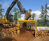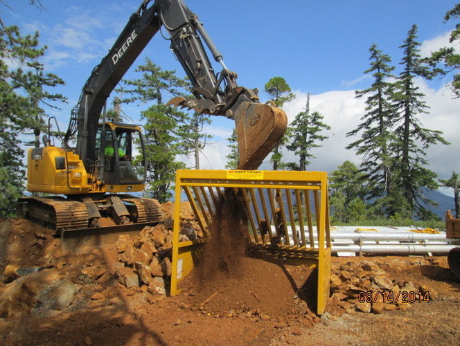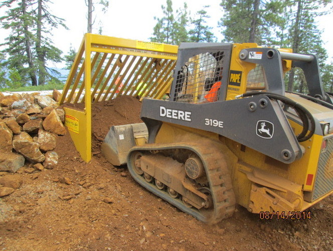 Rock Tough Static Grizzly, Model LDA8-2.25, 7’-11” wide x 7’ tall x 5’ deep constructed of 3” x 3” x 3/16” square tubing, 3/16” steel plate sidewalls, 3/16” steel plate front wall, standard grizzly bars constructed of 2 1/2” x 2 1/2” x 3/16” square tubing, grizzly bars bolt-in and are adjustable in 3/4” increments, screen angle set at 40 degree slope. Starting grizzly bar opening at 2 1/4”. Weight = 1,550 lbs.