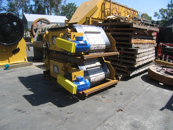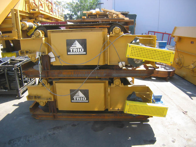 Trio model CR48 self-cleaning electro magnetic separator complete with 48" x 54" air cooled magnet with wound coils and class H insulation, 5 h.p. electric motor, shaft mount speed reducer, v-belt drive and drive guard, stainless steel armor clad belting, 4 pulley design with rubber lagged drive pulley, screw take-up assemblies, suspension lugs and rectifier.