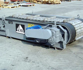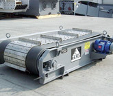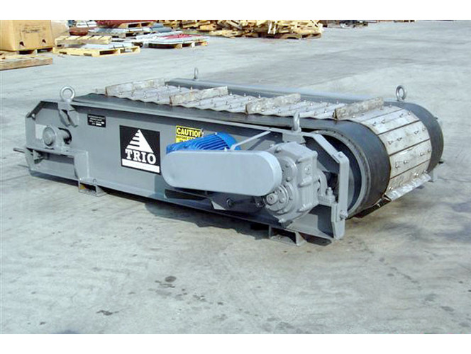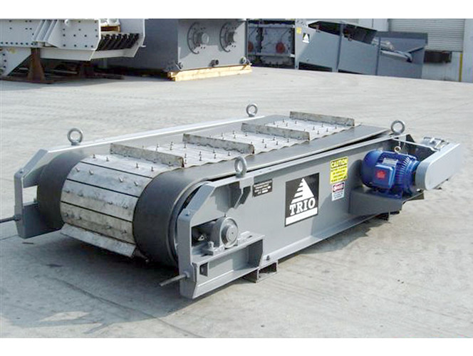Trio model CRP36 self-cleaning permanent magnetic separator complete with 36" x 42" magnet with solid steel core and heavy steel side plates, 3 h.p. electric motor, shaft mount speed reducer, v-belt drive and drive guard, stainless steel armor clad belting, 2 pulley design with rubber lagged drive pulley, screw take-up assemblies, suspension lugs.